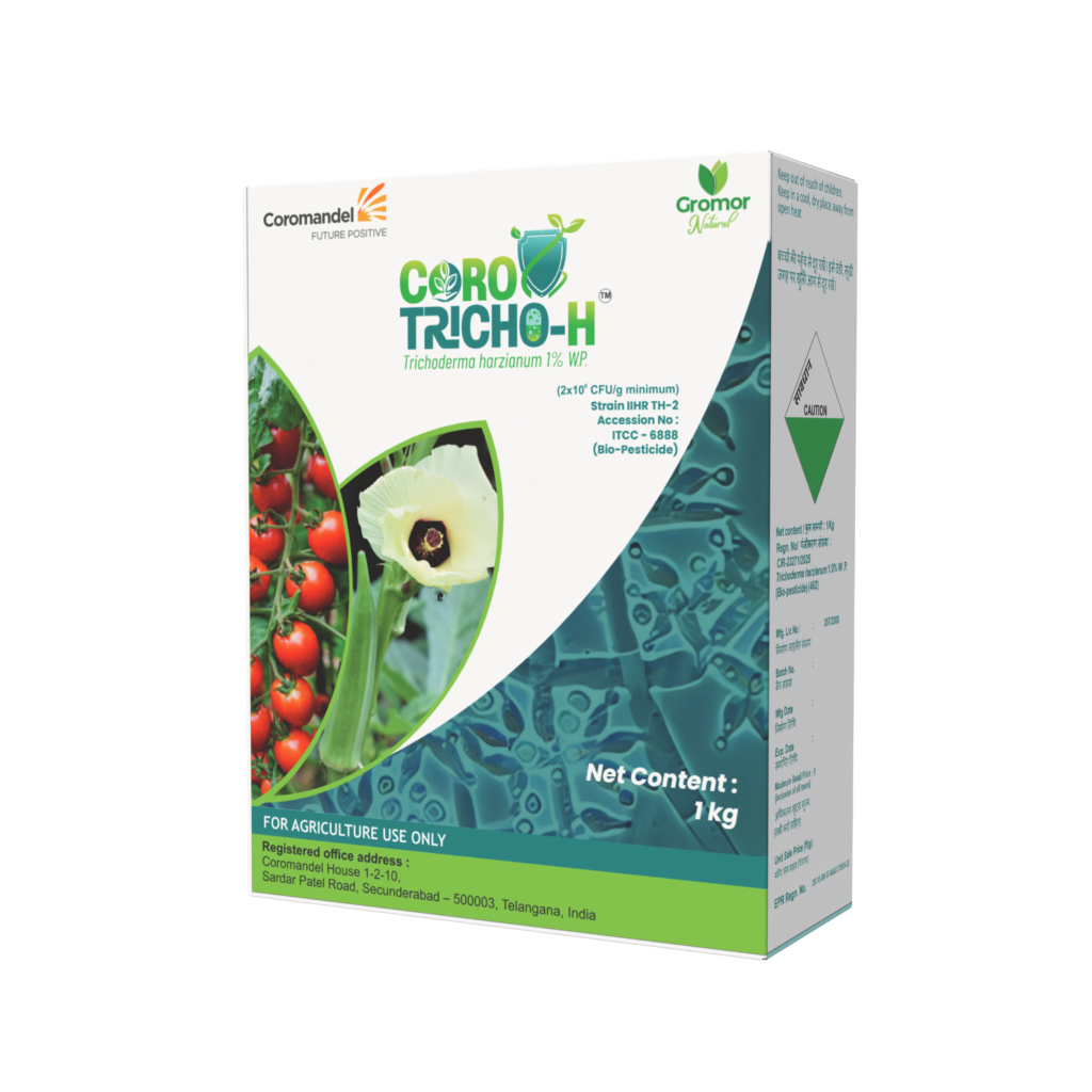 CoroTricho-H (Trichoderma harzianum 1.0% WP) is a powerful bio-control fungus that protects crops from soil-borne diseases while enhancing plant growth and resilience.